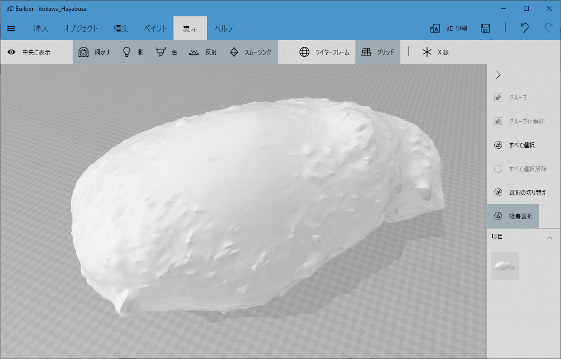 「いとかわ」はじゃがいものような形ですが、なまこともいわれているようです。大きいファイルだと、Microsoft 3D Builder に読み込むと動かないことがあるので、JAXAの一番小さいSTLファイルをダウンロードして使う事にします。