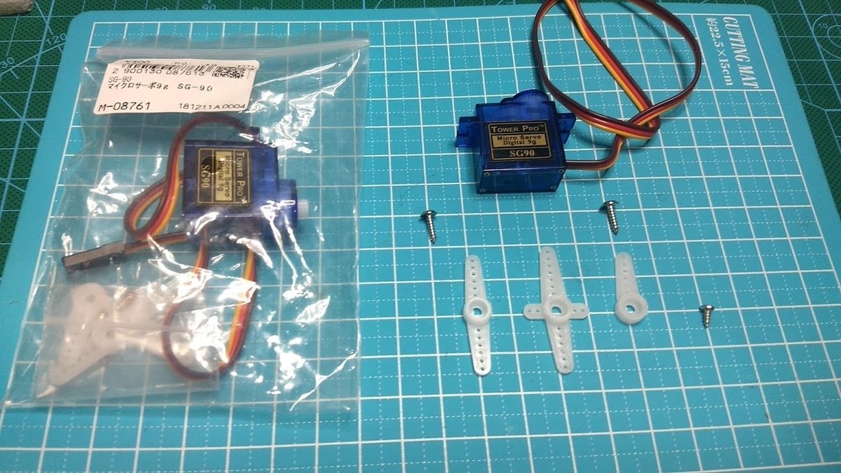 サーボモータには標準で何種類かのサーボホーンがついていて、それを自分の工作物に選んで使います。SG90や互換のサーボモータには、普通は三種類のサーボホーンが付属しています。